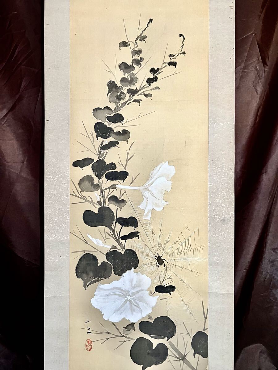 - 【模写】【S8】在銘「夕顔に蜘蛛」絹本 夏景 花鳥図 鳥獣 蜘蛛の巣 絵画 掛軸 日本 中国美術