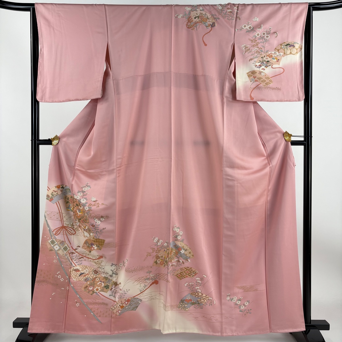 - 訪問着 身丈161.5cm 裄丈65cm M 袷 扇面 花鳥 金彩 ぼかし ピンク 正絹 秀品 【中古】