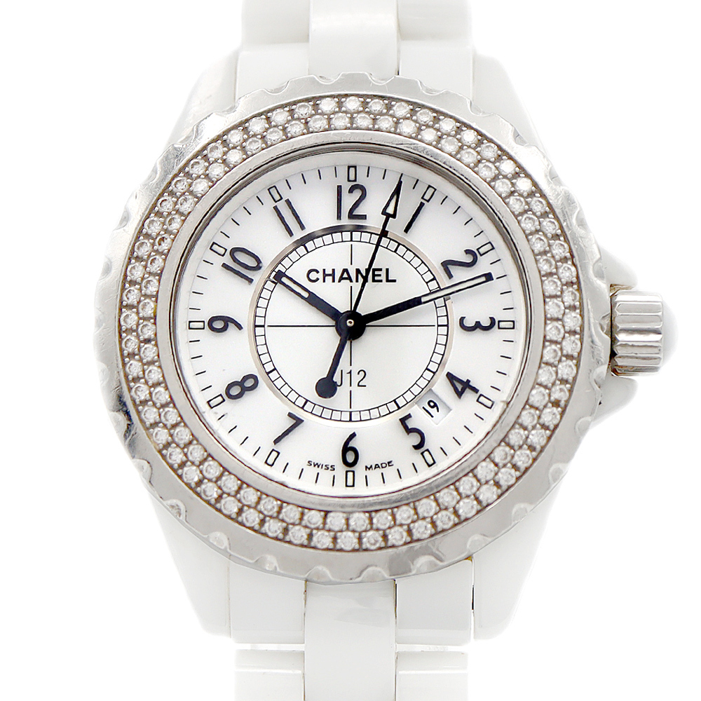 > 電池交換済 CHANEL シャネル J12 33mm 二重ダイヤベゼル H0967 ダイヤモンド デイト 200m防水 ホワイト レディース クォーツ