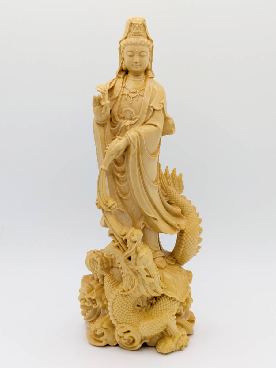 - 【アウトレット品】 騎龍観音 17cm 天然木製(柘植ツゲ) 木彫仏像 龍神 龍乗観音 龍観音 龍上観音 厄除け