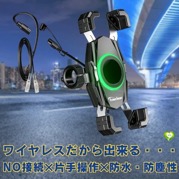 > 【NO接続スタイリッシュ高速充電】スマホホルダー バイク用 カエディア 充電 QI USB電源 ワイヤレス 振動吸収 2色展開 防水 取付簡単