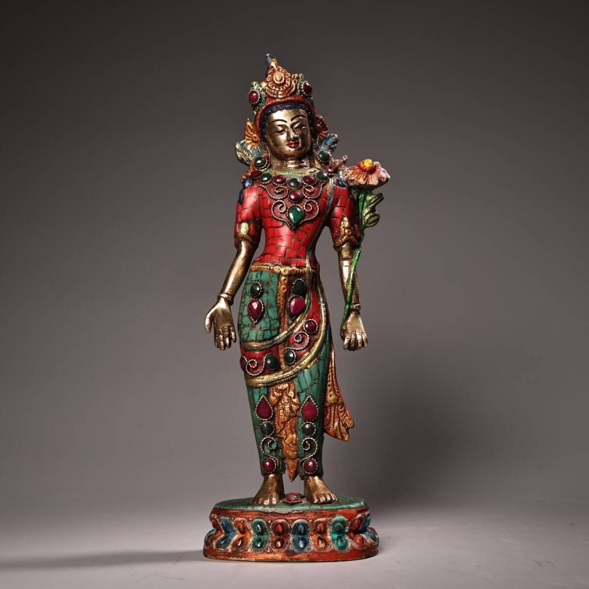 > 【仁】『銅製・寶石嵌・描金・彩繪・站度母像・仏像・宗教・仏教古美術・供養品』極細工 古董品 中国古玩 古美術 古美味 時代物 旧家蔵出