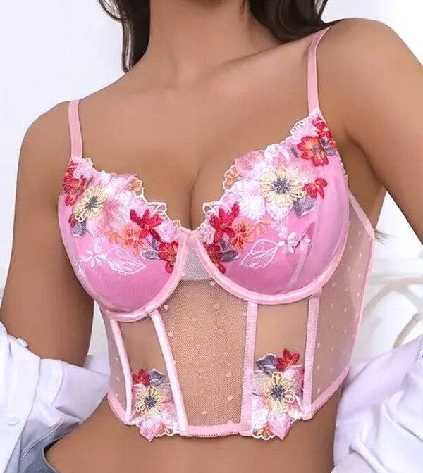 > ◆ラグジュアリー 大花刺繍&美レース ブラジャー(ビスチェ) C85-C90 (バスト100-108cm) ピンク系♪新品:大きいサイズ◆送料230円(匿名)◆