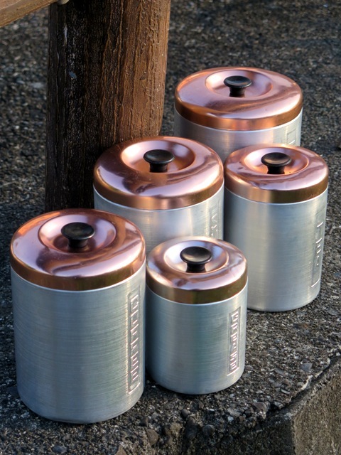 - Vintage ITALY aluminum Canisters, Copper Top 5 PIECE ビンテージ レアGREASE缶付属 キッチン キャニスターカッパーT イタリー製