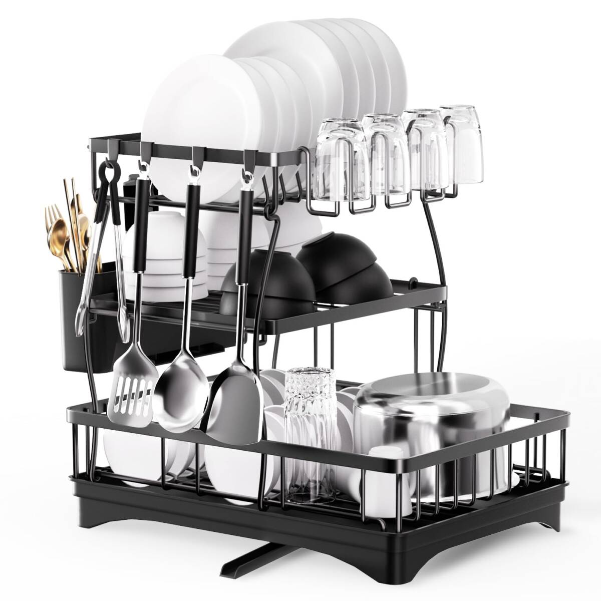 - 食器乾燥 防錆炭素鋼製 食器置き場 キッチンラック ・まな板立て・4枚の物掛けフック付き】水が流れる ラック【360度回転なトレー