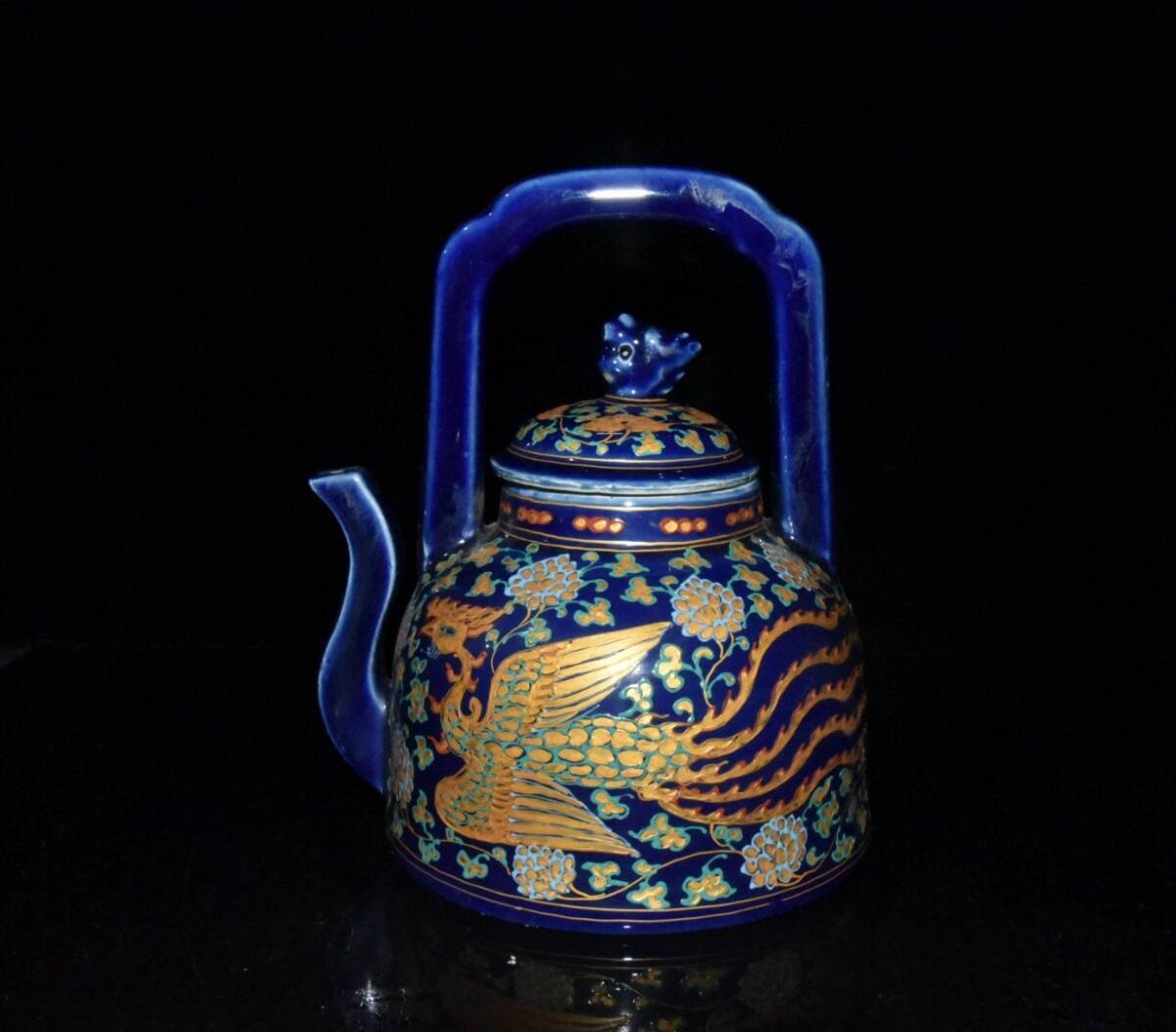 - 蔵友旧蔵出 明 永樂年製款 霽藍釉 描金 鳳紋 提梁壺 稀少珍品 貴重品 古陶瓷品 置物 古賞物 中国古玩 中国古美術品