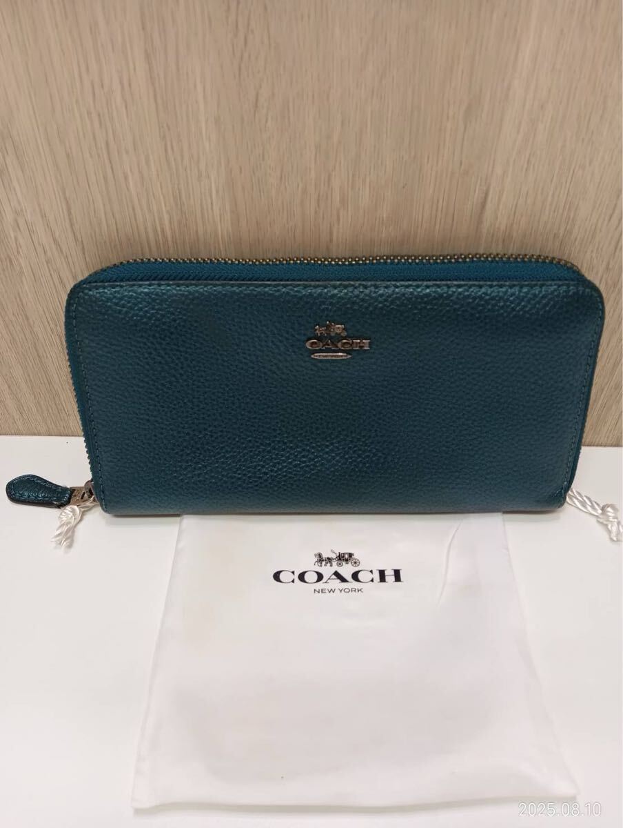- 【中古品】 COACH コーチ グリーン ダークブルー レザー 長財布 ラウンドファスナー レザー 現状品