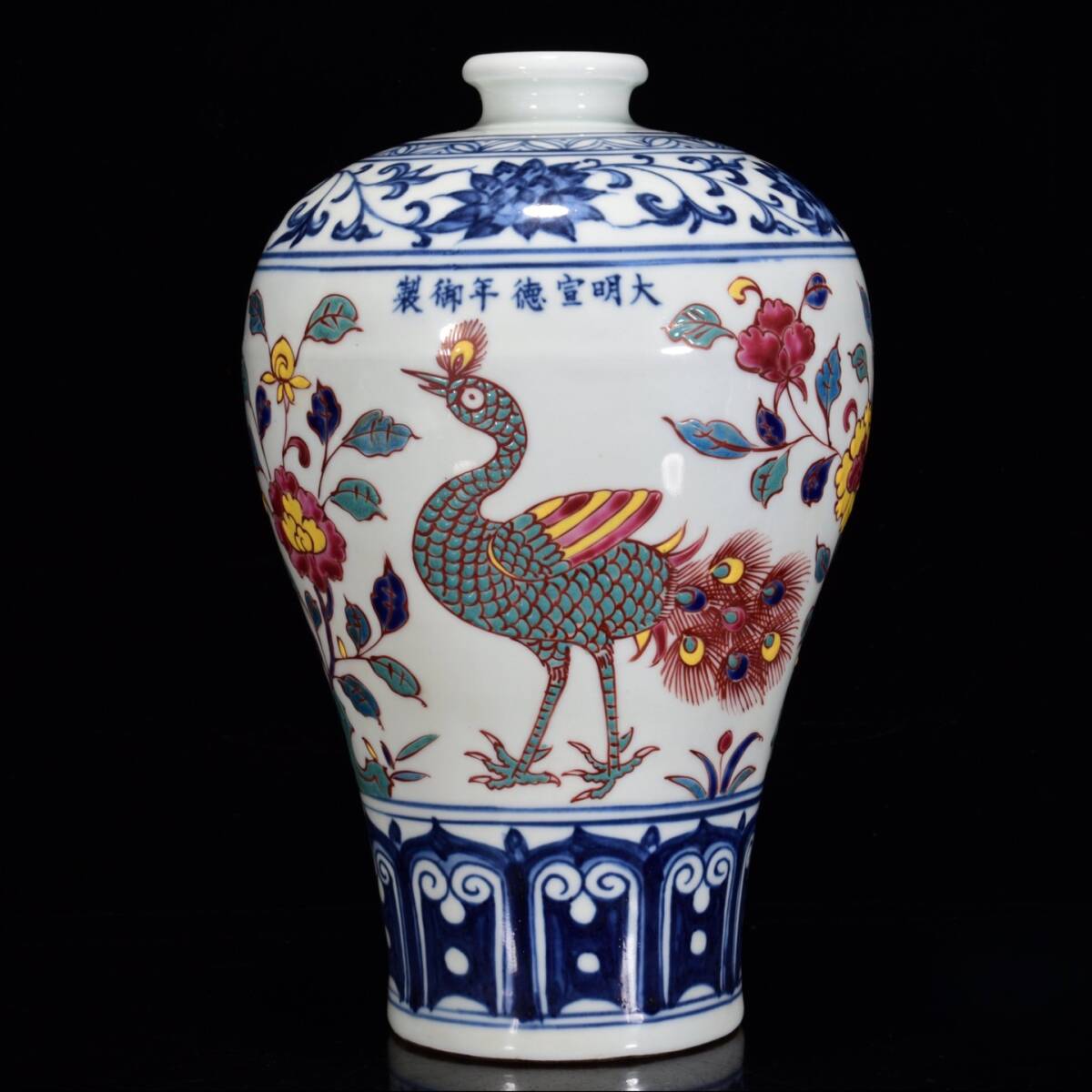 - 『館蔵珍品 明 宣德年製款 古陶瓷品 青花 加彩 孔雀牡丹紋 梅瓶』置物 賞物 貴重物品 収蔵品 中国古美術