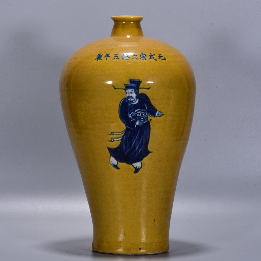 - 『館蔵珍品 元 古陶瓷品 黄釉 青花 人物紋 梅瓶』置物 賞物 貴重物品 収蔵品 中国古美術