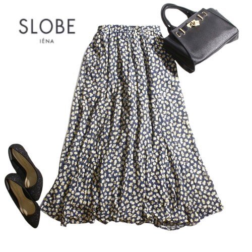 > 美品 スローブ イエナ SLOBE IENA 春 夏 ストライプ 柄 フラワー プリント ロングフレアスカート シルバーラメ ネイビー 紺 イエロー 黄色