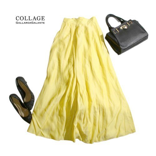 > 美品 COLLAGE GALLARDAGALANTE コラージュ ガリャルダガランテ 夏 リネンタッチ ポリエステル 艶 ロングスカート イエロー 黄色 フレア