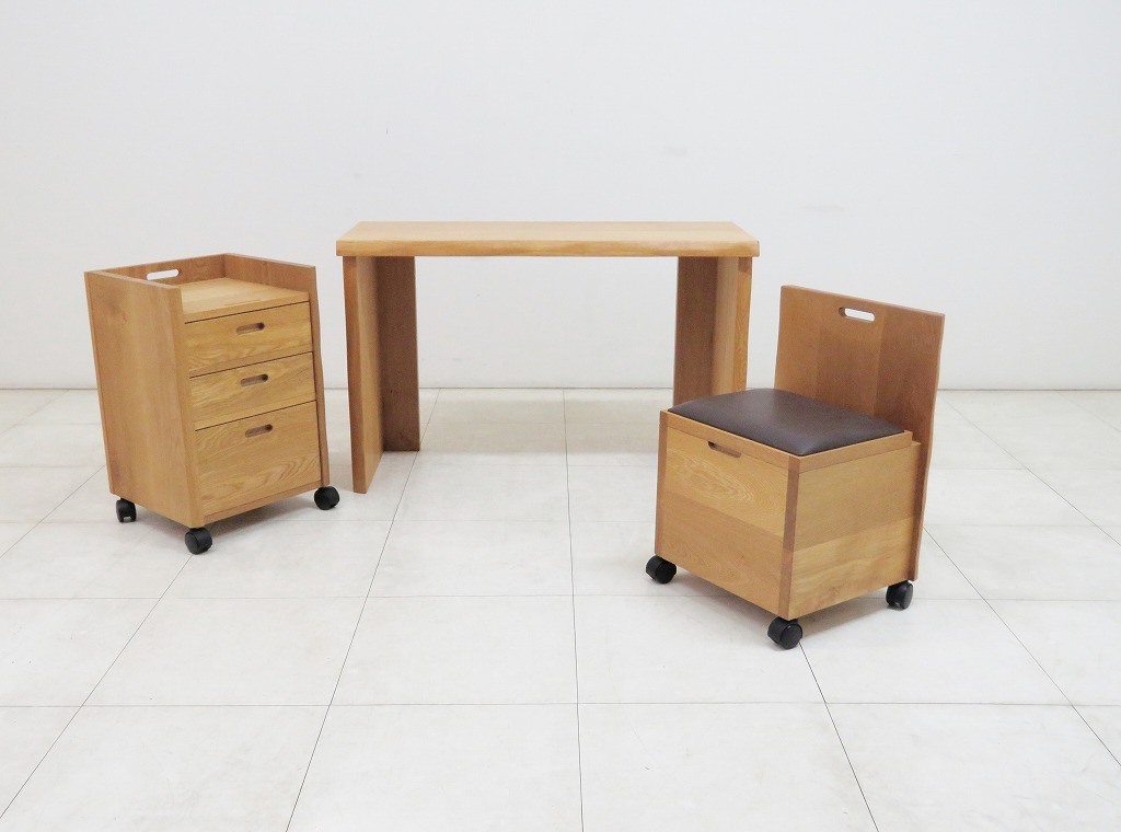 - ナラ無垢材 デスク&チェストワゴン&チェア セット 本革張り 机 作業台 検MUKU工房北の住まい設計社キツツキ柏木工