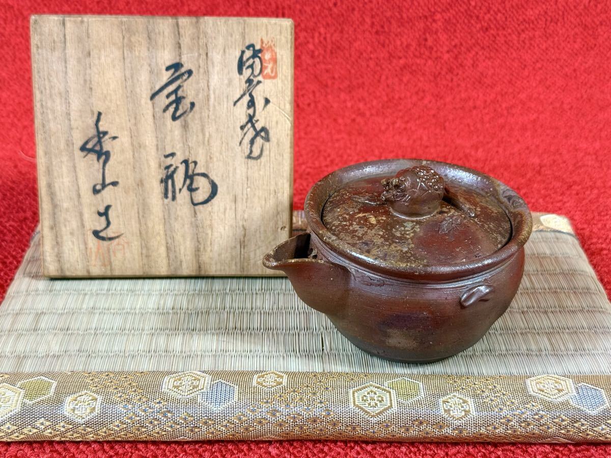 - 備前焼 宝瓶 香山 造 備前 柴岡香山 柘榴 摘み ざくろ 掴み 煎茶道具 茶道具 茶器 急須 陶印 在銘 木箱付 o194
