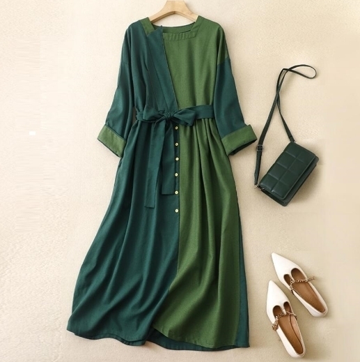 - ワンピースゆったり配色 切り替えワンピース長袖 復古風マキシ丈 大きいサイズ 着心地快適 大人 着やせ ロングワンピース Lサイズ選択可