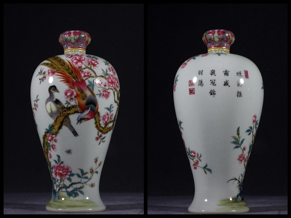 - 「清 雍正年製 陶磁器 粉彩花鳥紋 蒜頭瓶」染付 置物 擺件 古賞物 中国古美術 旧蔵出