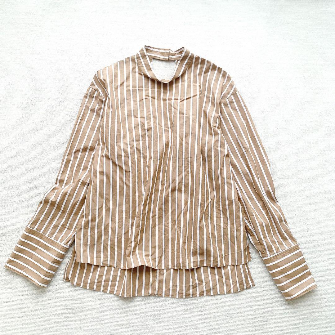 - 良品 ガリャルダガランテ GALLARDAGALANTE NAVY ブラウス シャツ 長袖 レディース コットン 綿 リボン ストライプ ベージュ F