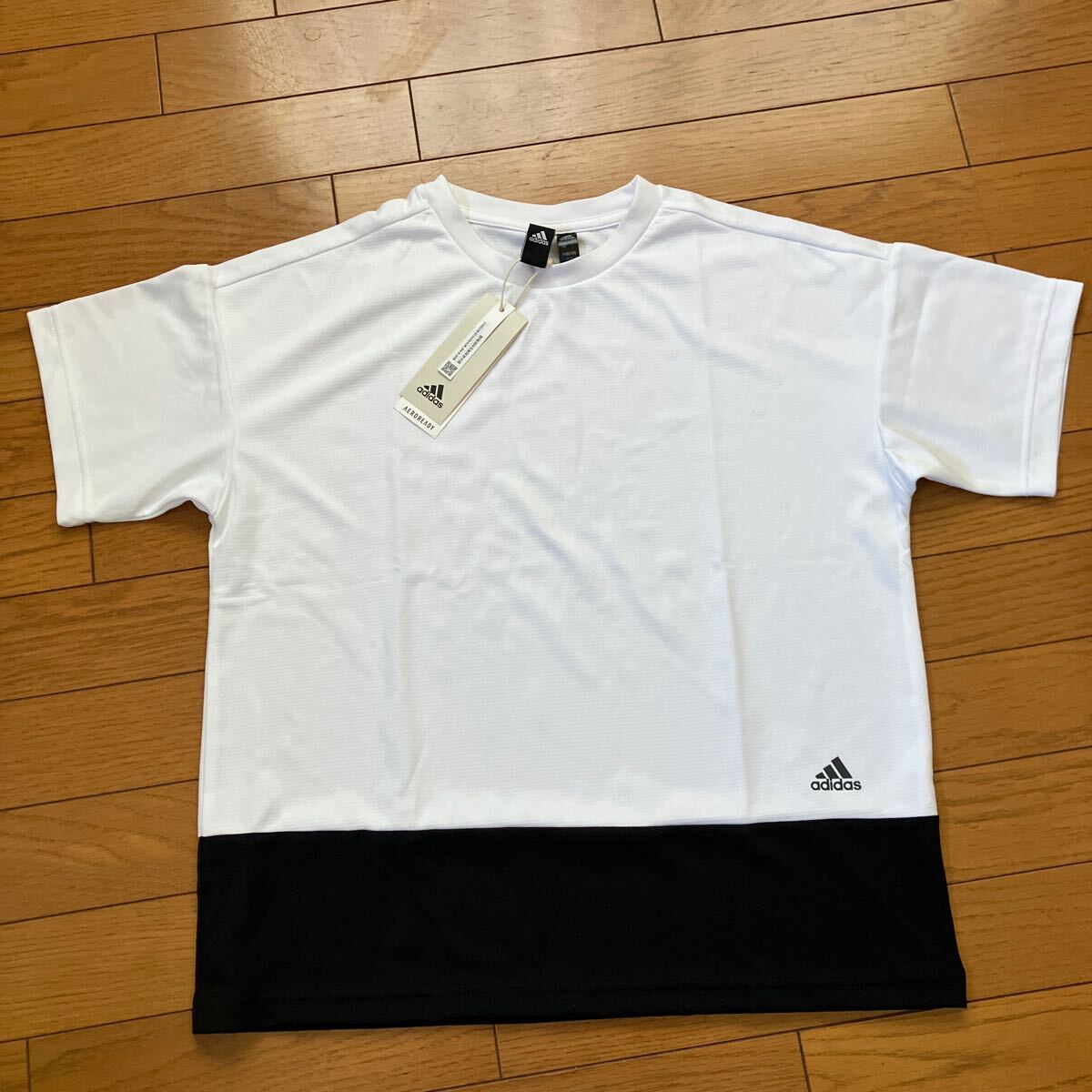 > ♪新品タグ付 アディダス adidas 裾パネル切替 ルーズシルエット半袖Tシャツ 定価3,630円 白×黒 М ダンス ヨガ トレーニング