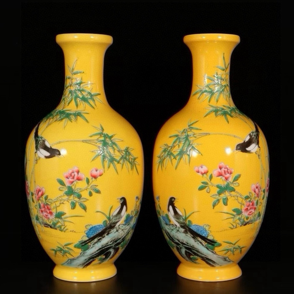 > 清時代 雍正年製 粉彩黄地 節高昇盤口瓶 陶磁器 中国美術 高さ21 cm 直径9 cm 骨董品 唐物 820