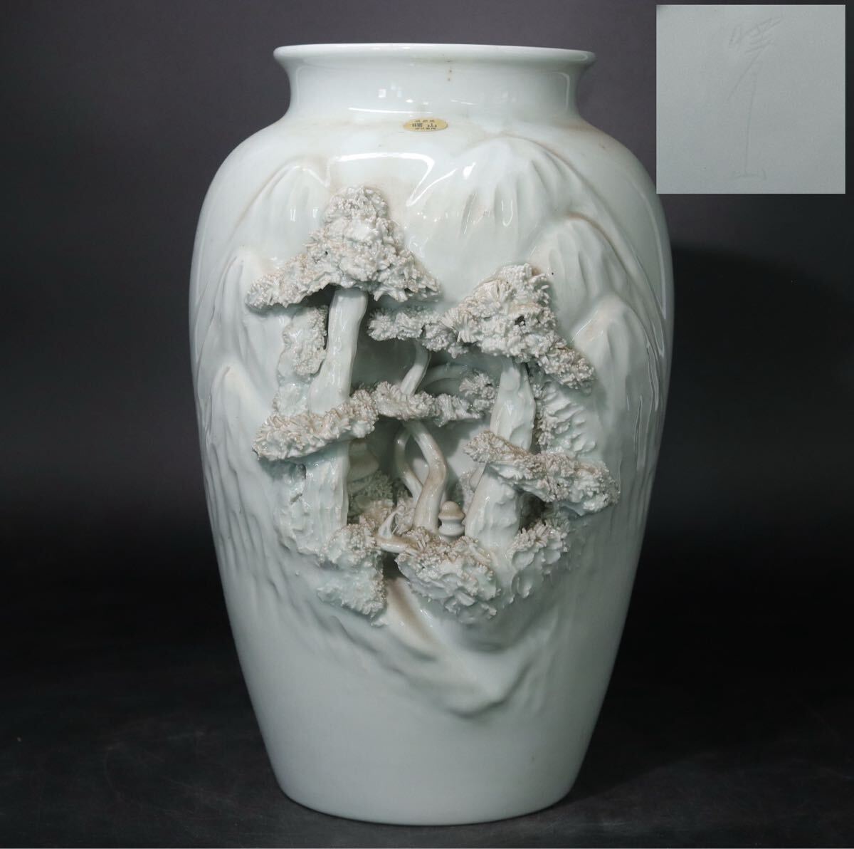 - 砥部焼 曙山 作 細工 松・風景・人物 浮彫 白磁花瓶 / 茶器 花瓶 壺 細工物 検索: 二六焼 水月焼 .B929