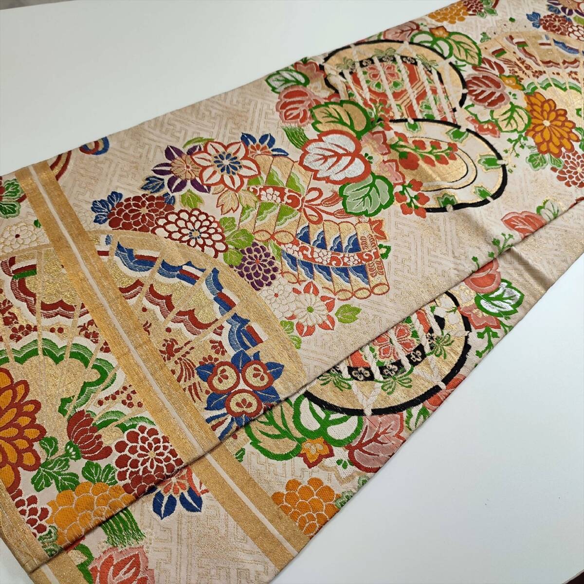 - ■着物の越田■幅32長さ411 正絹 アンティーク 丸帯 ハギレ・リメイク向け 両面全通 金糸・銀糸有り 鼓 扇 菊■み19J09