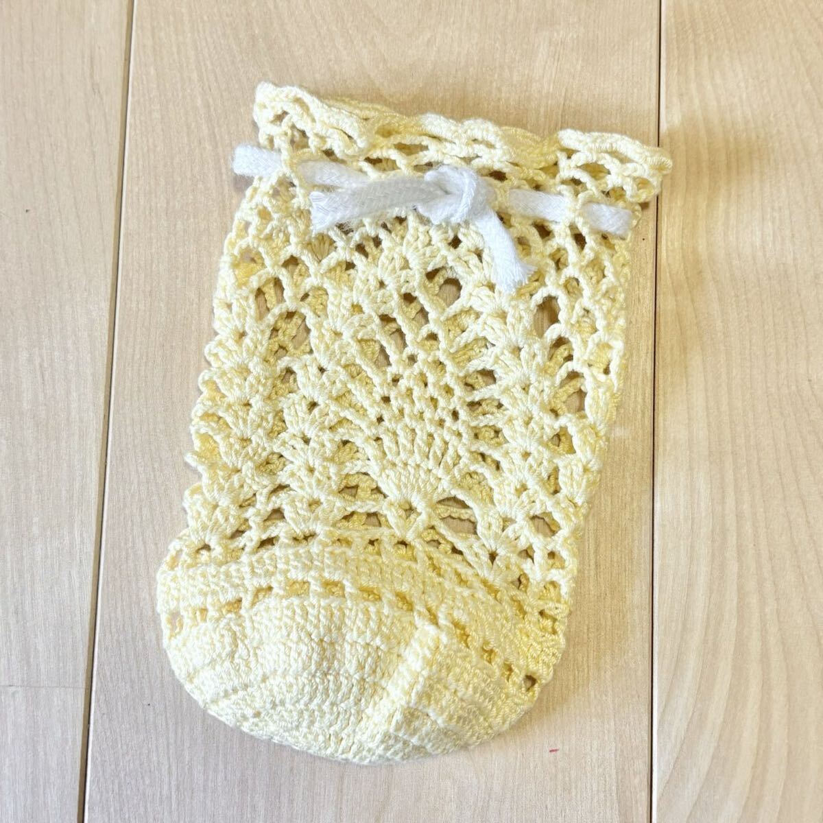 - 新品未使用 マチ付きポーチ かぎ針編み レース編み クリームイエロー 黄色 小物入れ メイクポーチ マルチポーチ