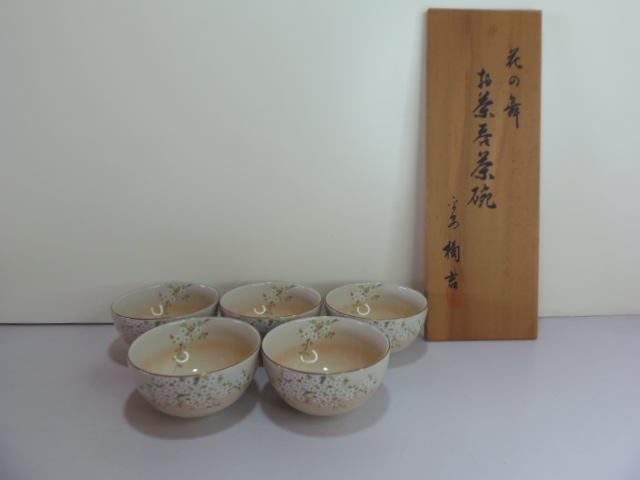 - s37 【平安 橘吉】 お茶呑茶碗 湯呑 5客セット 花の舞 ※難有(一つ黒茶色のシミ有)