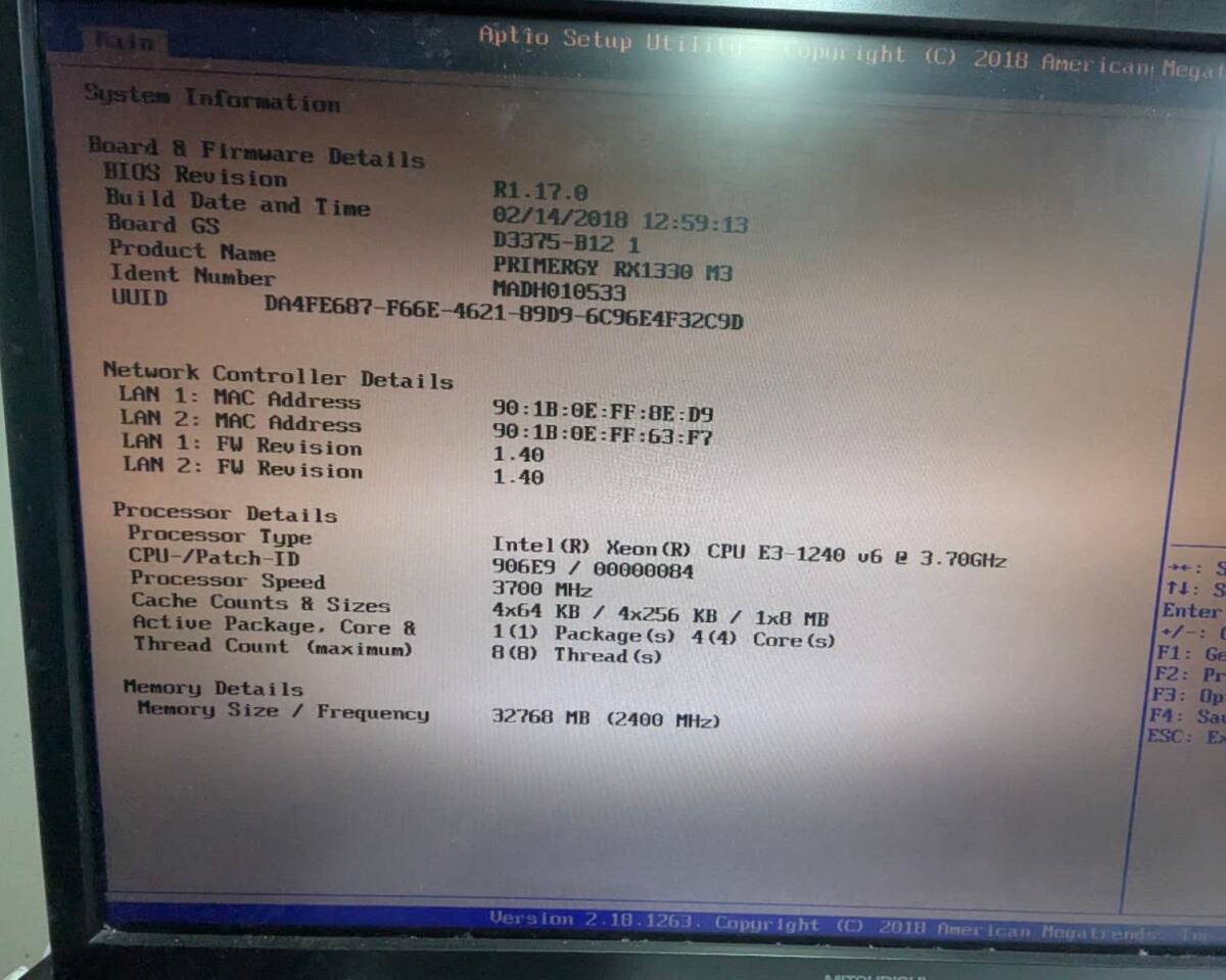 > 【通電確認のみ】現状品、FUJITSU PRIMERGY RX1330 M3 E3-1240v6 メモリー PC4 8GBx4枚 計32GB HDD無し サーバー SA25081901