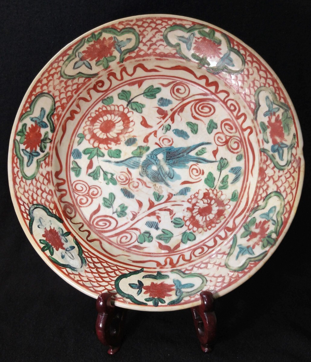 - 古い中国 明末 赤絵 波文 花鳥図 27cm 中皿 中国美術 b-57a4522-cgg