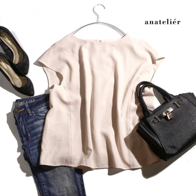 > 美品 アナトリエ anatelier 株)ワールド 夏 シンプル ジャージ― バックレースアップ フレンチスリーブ 半袖 カットソー 9号 38 ベージュ