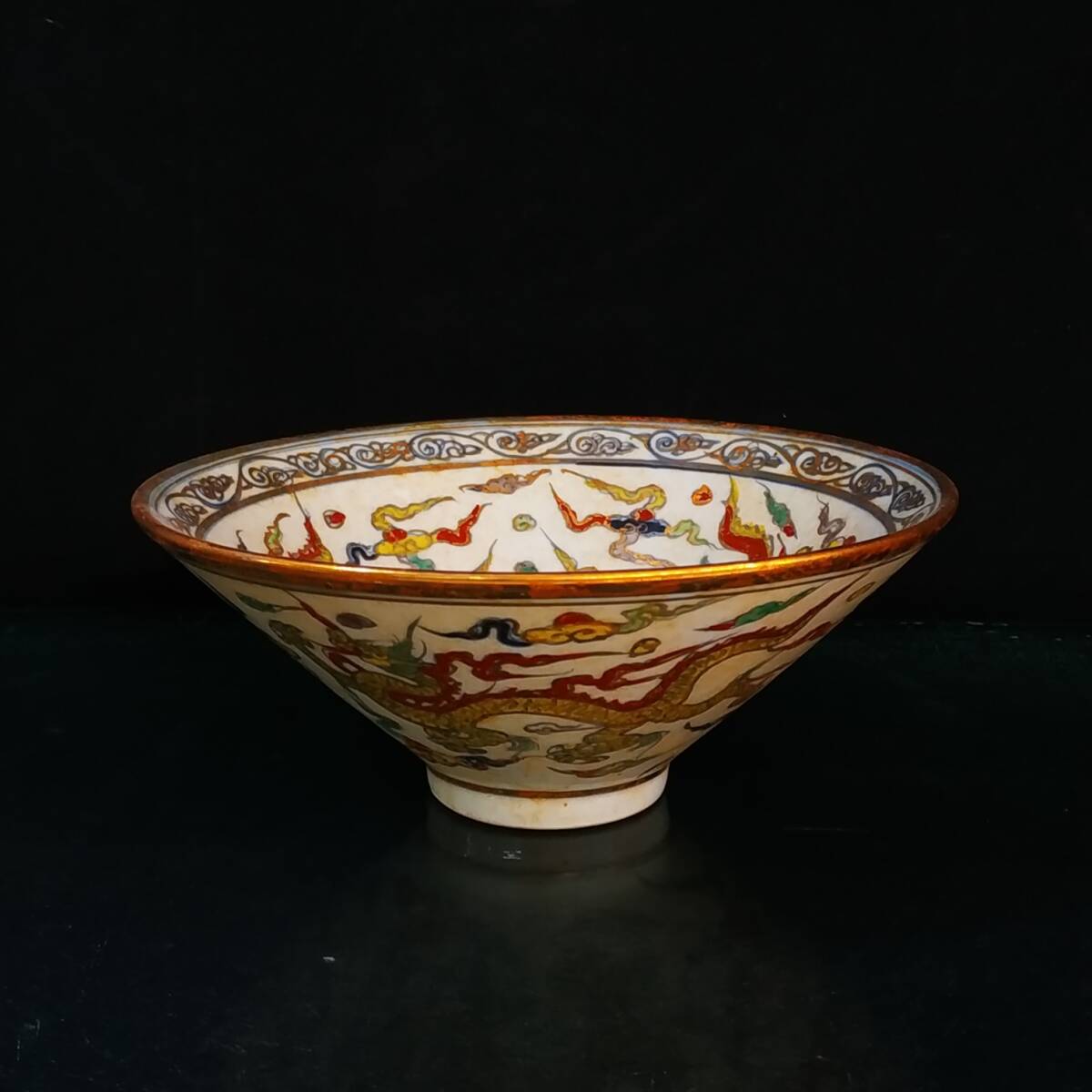 - zz8|7625 中国磁器 陶芸 磁器『大明成化五彩手画竜紋蒔絵笠碗』施釉陶 古代工芸品 陶芸 精美彫 置物 收藏品