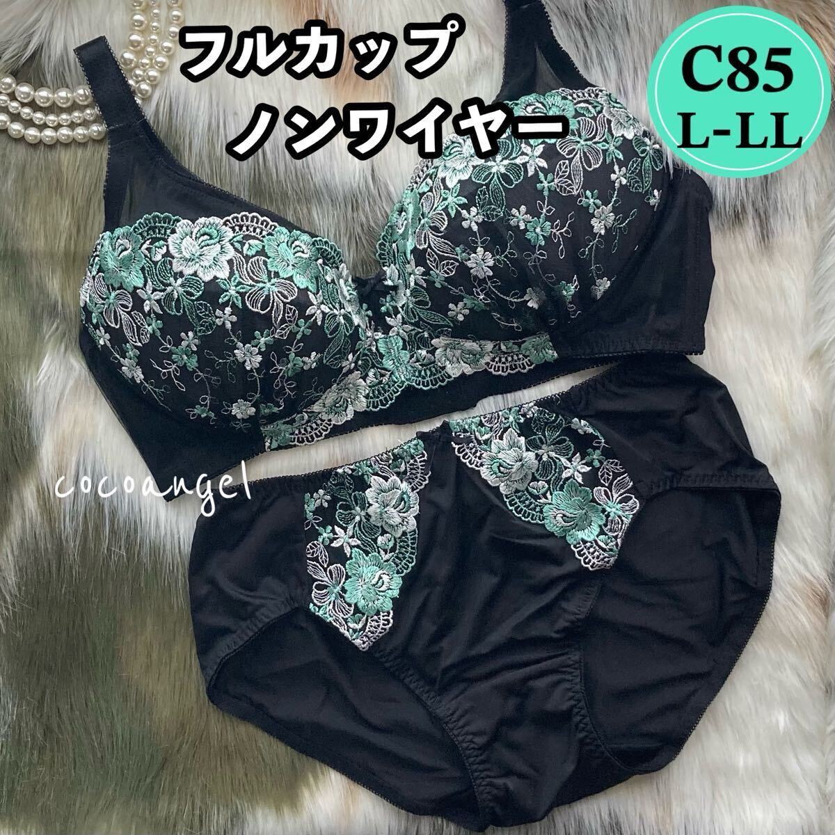> ラスト【C85L-LL ブラック ノンワイヤー】新品 フルカップ ブラジャーショーツ Cカップ パッドなし パンティ 花柄刺繍 女装 大きいサイズ