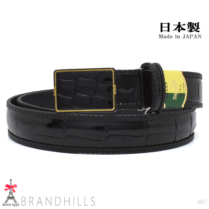 - クロコダイル ベルト メンズ ブラック シャイニング加工 紳士用 幅35ミリ ピンバックル式 革編み縁取り 裏:牛革 日本製 新品