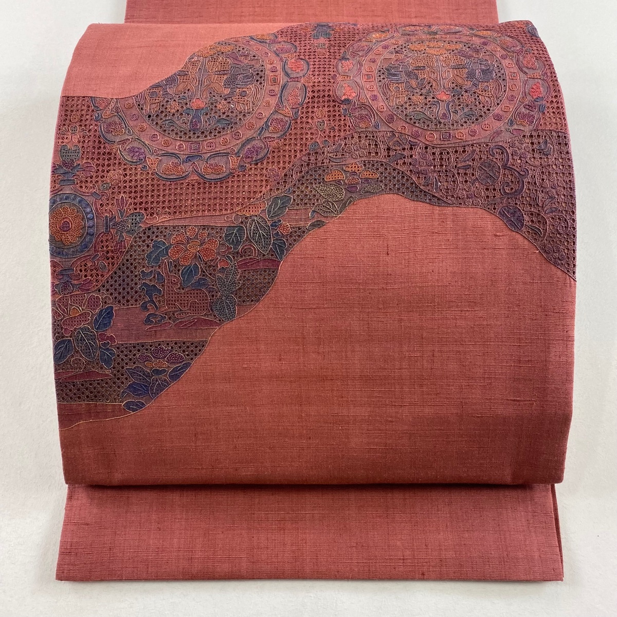 - 袋帯 美品 秀品 狩猟紋 花うさぎ 刺繍 金彩 濃ピンク お太鼓柄 正絹 【中古】