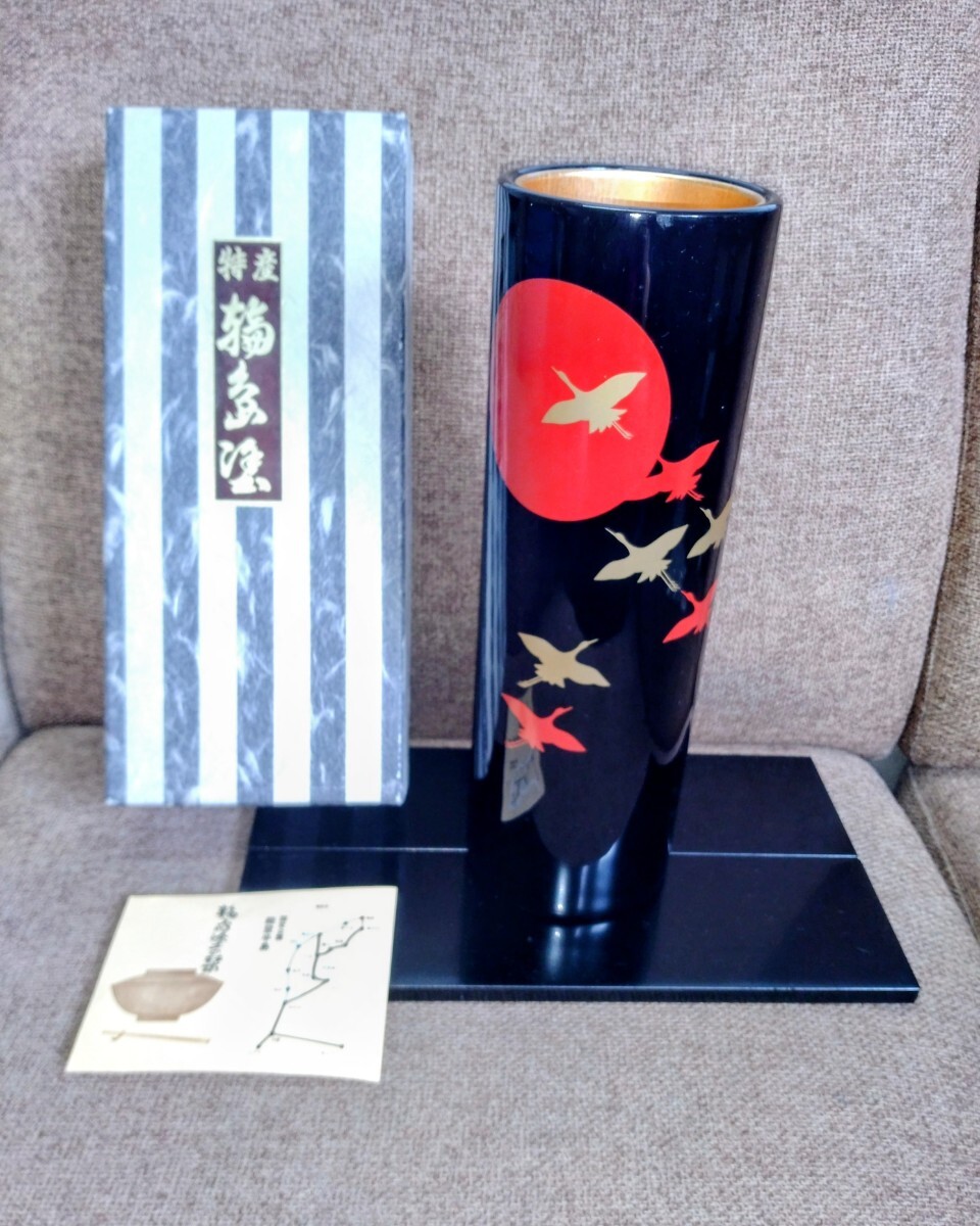 - K338 輪島塗 旭日鶴花器 日の出鶴 花瓶 花器 花生 花入 漆器 インテリア