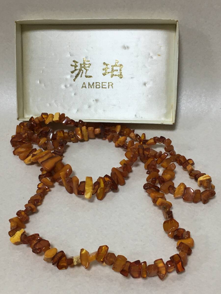 - E397 琥珀 ネックレス ペンダント ロング 155cm アンバー amber 箱付き アンティーク
