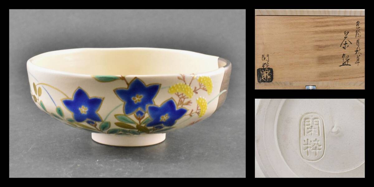- ▲楠廸庵▲色絵月秋草茶碗 南口閑粋作 茶道具