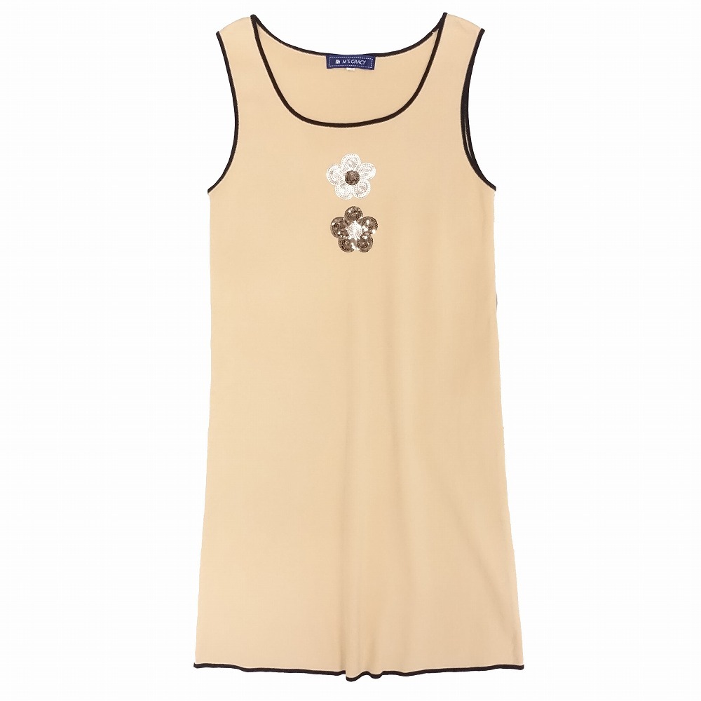 > MS GRACY エムズグレイシー スパンコール フラワー カノコニット ワンピース ノースリーブ ひざ丈 40 L ベージュ レディース 【中古】