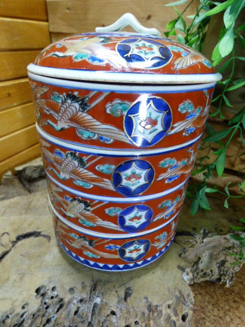 - む125.4段重 陶器製 蓋付き 保存容器 丸重 金彩 鶴 唐草 色絵 骨董品
