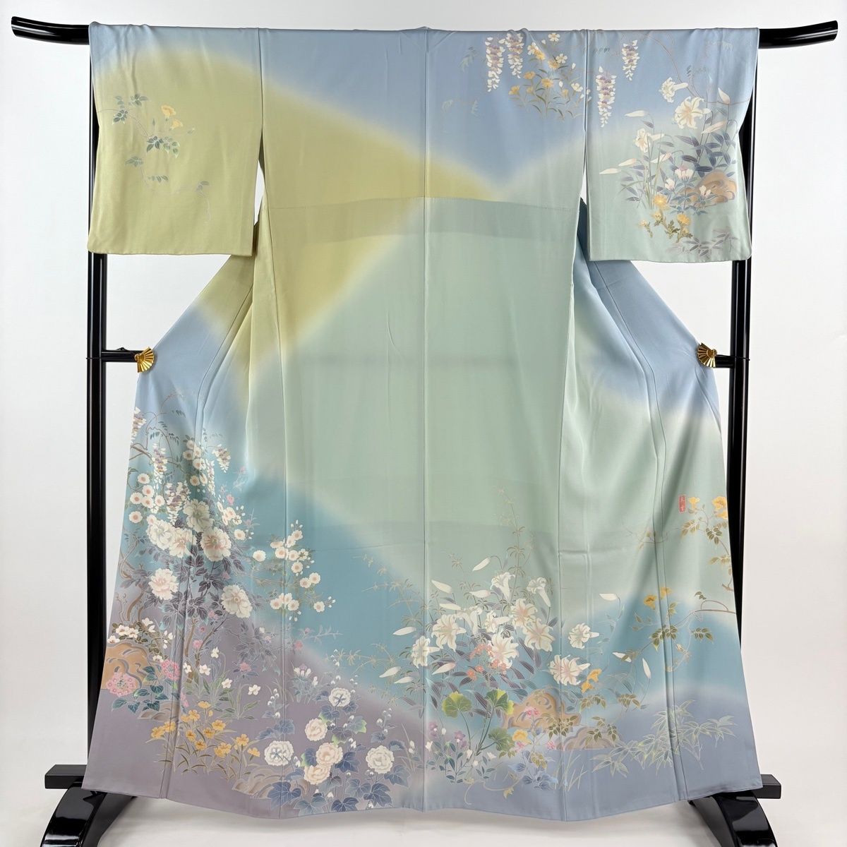 > 訪問着 身丈161.5cm 裄丈66.5cm M 袷 圭雲 鈴乃屋 落款 牡丹 桜 染め分け ぼかし 青灰色 正絹 逸品 【中古】