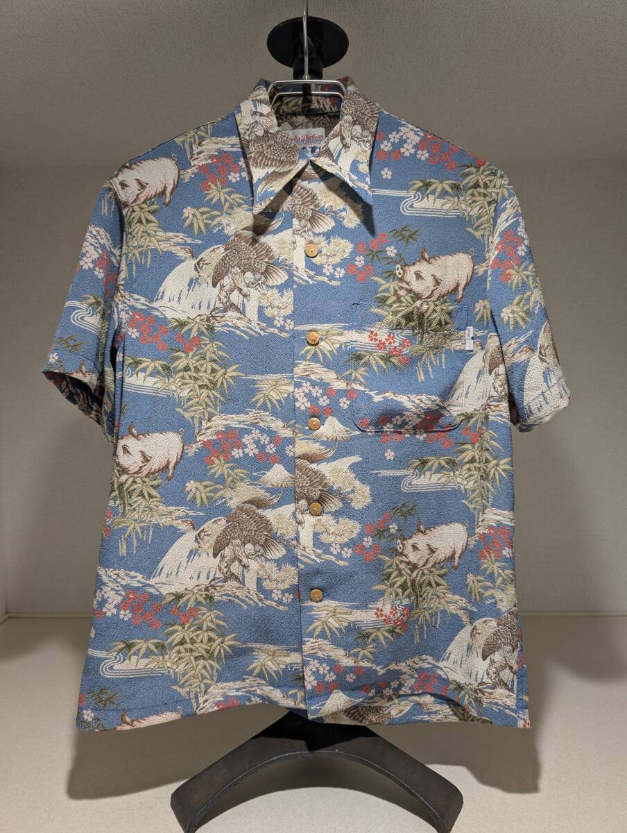 > ステュディオダルチザン 豚柄 ポリ縮緬アロハシャツ M ブルー系 ポリエステル100% 和柄 ハワイアン 半袖 STUDIO D'ARTISAN