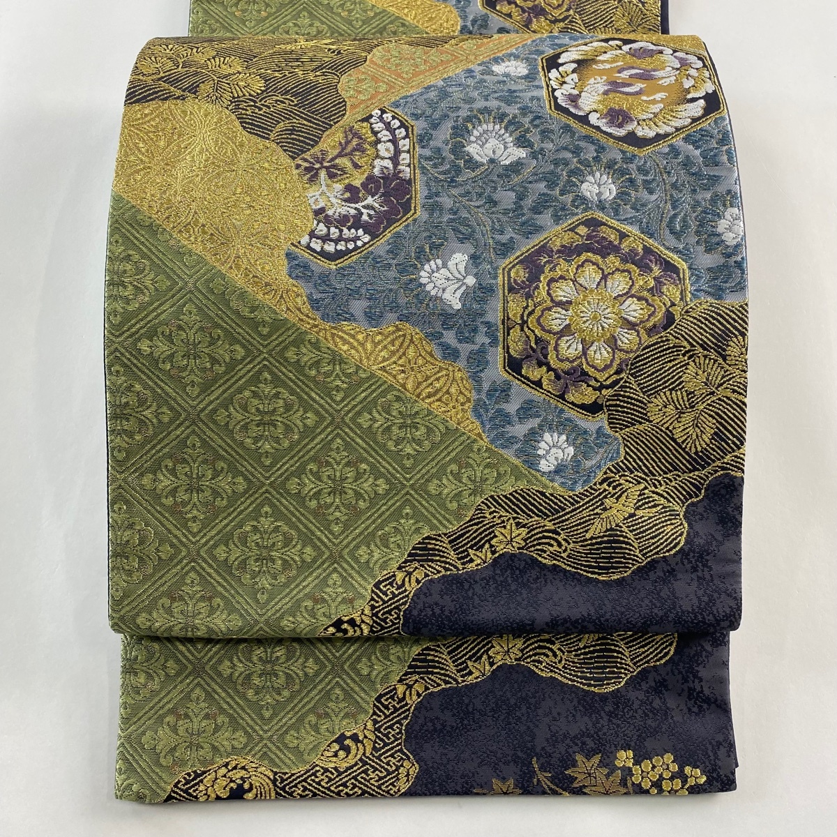 - 袋帯 美品 秀品 亀甲華文 波 金糸 箔 よもぎ色 六通 正絹 【中古】