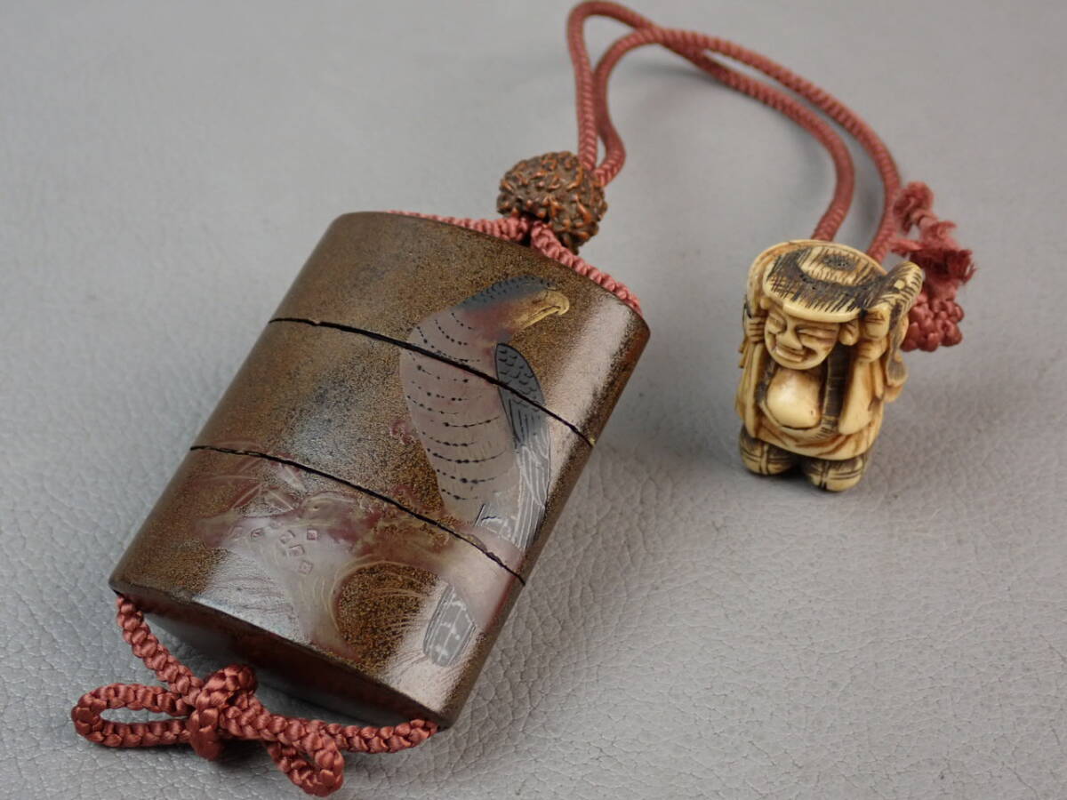 - 【骨董・提物】★古い 蒔絵 梨地★★鷹文印籠 大黒根付 緒締 gn062sgl