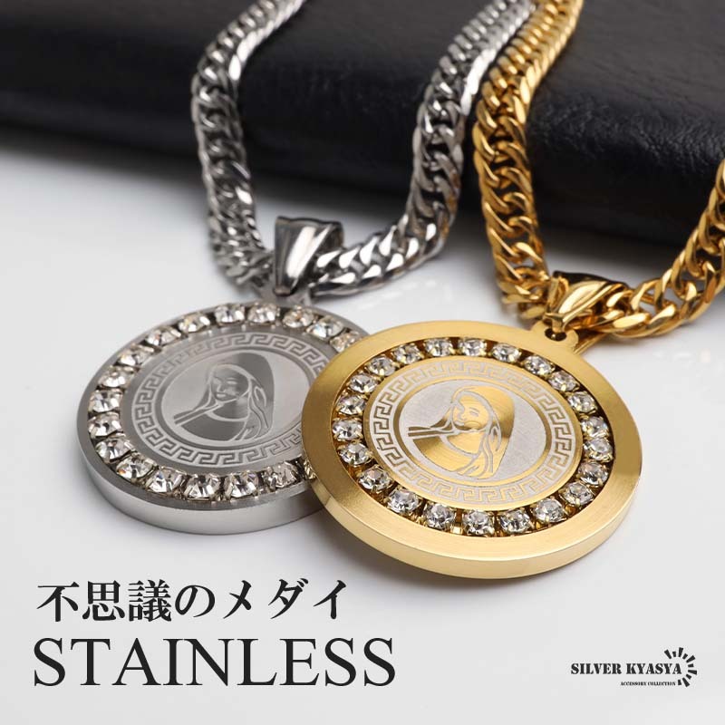 - (ゴールド、60cm) ステンレス マリアネックレス ペンダントネックレス メンズネックレス ダブル喜平 メダイ 金アレ対応
