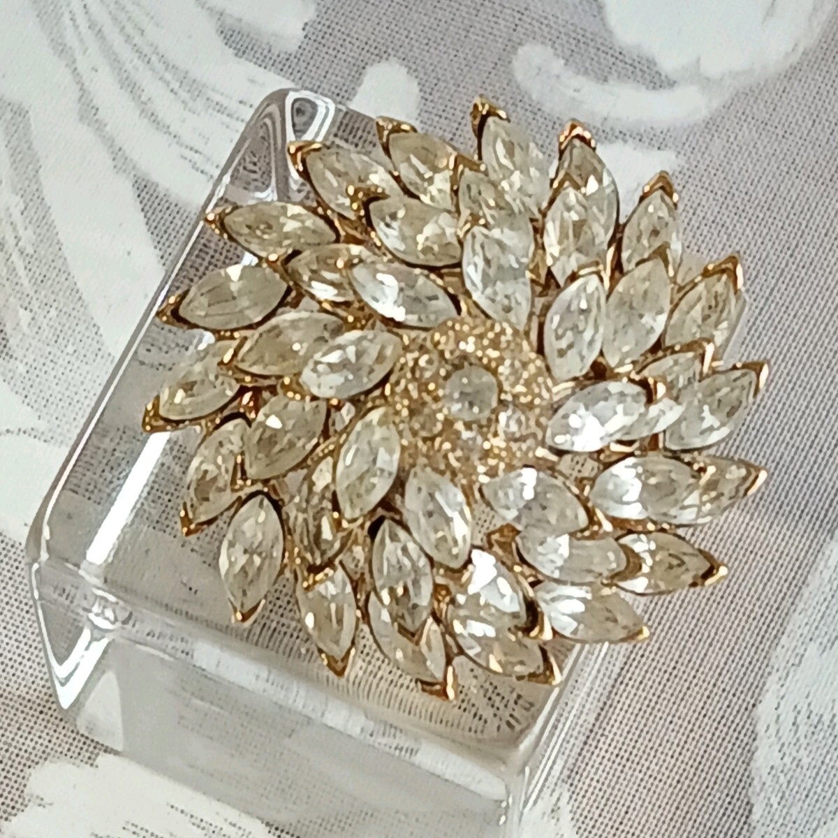 - ゴールドカラー マーキスカット ラインストーン デザインブローチ 美品