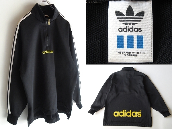 > 希少 90sビンテージ adidas アディダス ロゴ刺繍 トレフォイルロゴジップ ハーフジップ プルオーバージャケット ジャージ M-L 黒 ブラック