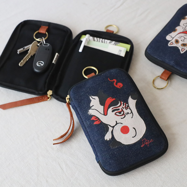 - 芸術の秋SALE Lサイズ 手描きART クッション 厚地インディゴデニム キーケース お薬手帳ケース 猫と歌舞伎 レザー S07B