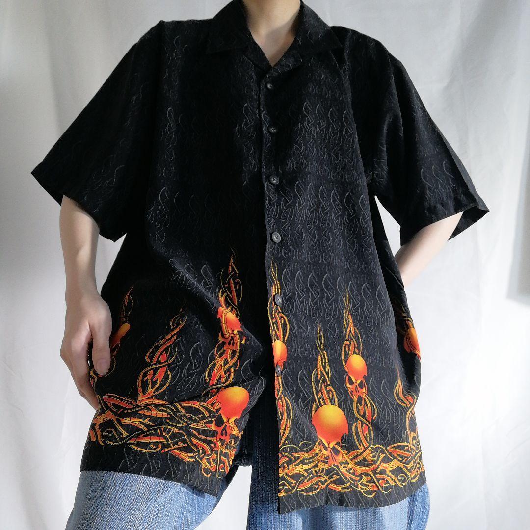> 00s 海外古着 ヴィンテージ オープンカラーシャツ 半袖シャツ スカル 髑髏 総柄 ポリシャツ 柄シャツ レトロ ストリート 黒 メンズ XL 1693