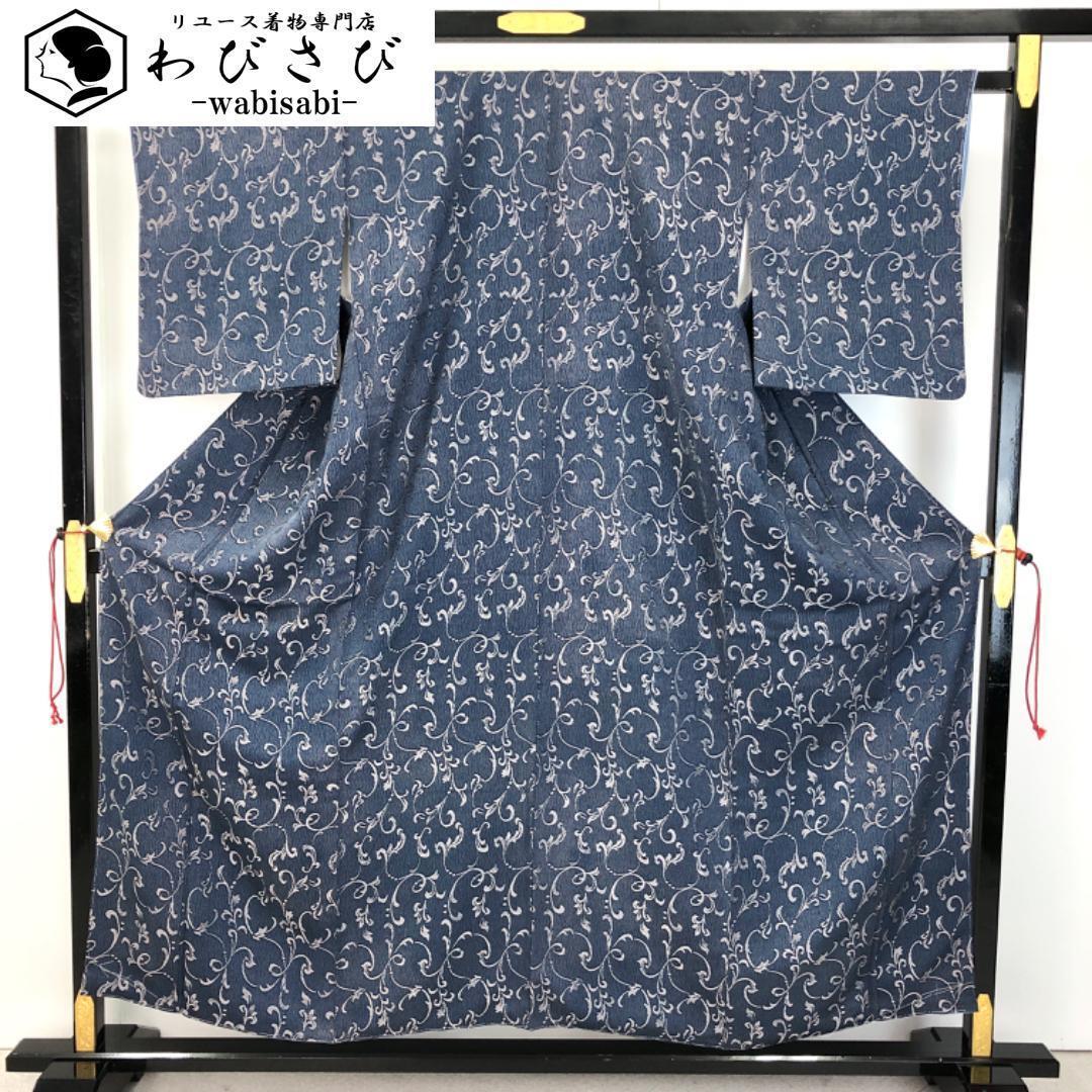 > 小紋 光悦 いろは 花唐草模様 紺藍色 しつけ糸 K-5190 着物 きもの kimono 和服 和装 中古 リサイクル着物 【送料無料】