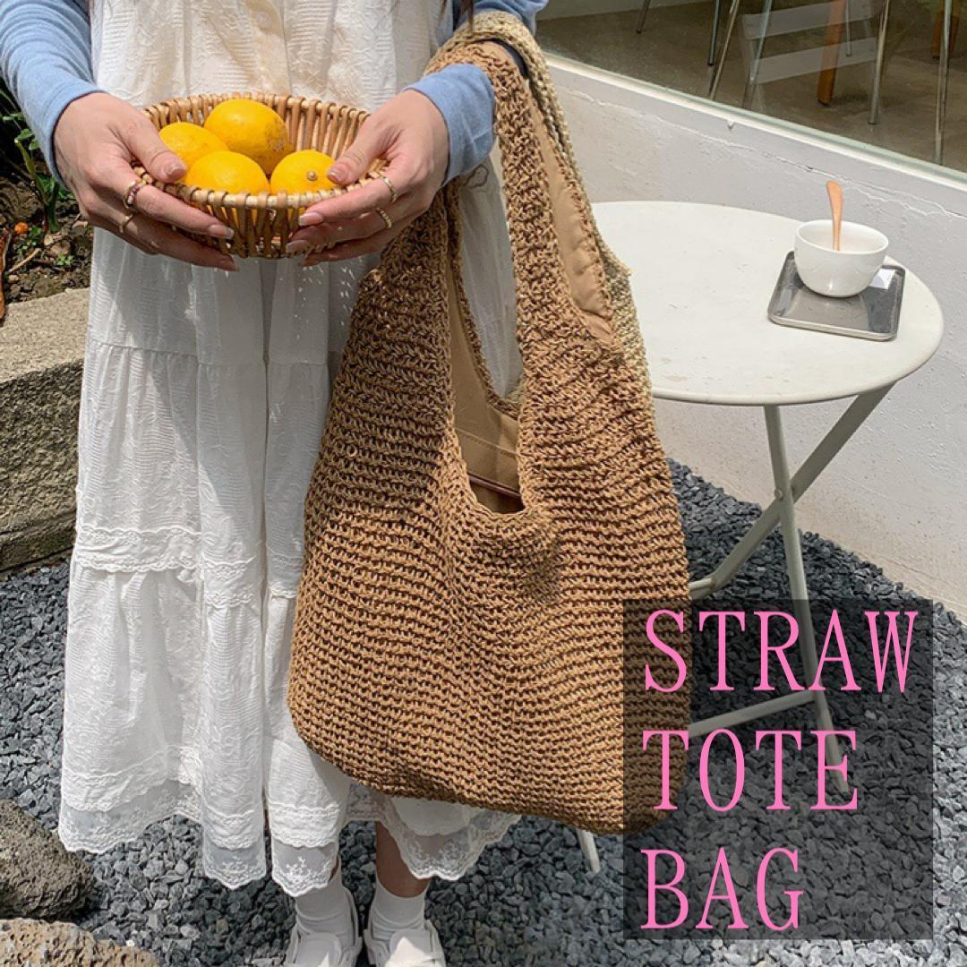 - トートバッグ ブラウン 大容量 A4 ストローバッグ 軽量 かごバッグ