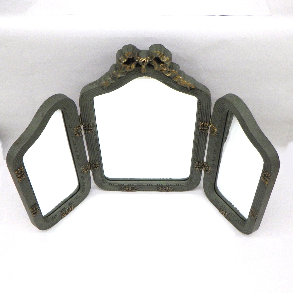 - SI-55 イタリア製 三面鏡 リボン 卓上用 W67×H45.5cm グリーン系 緑 アンティークショップ保管品 デッドストック ヴィンテージ